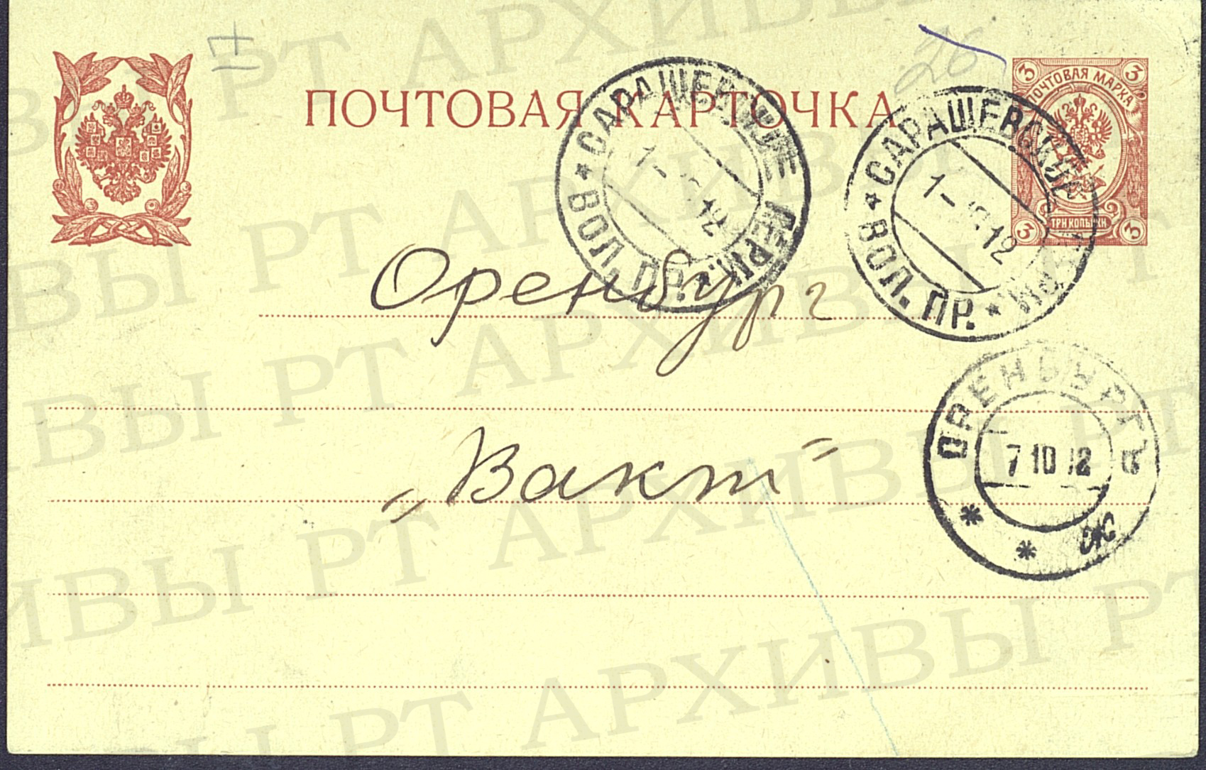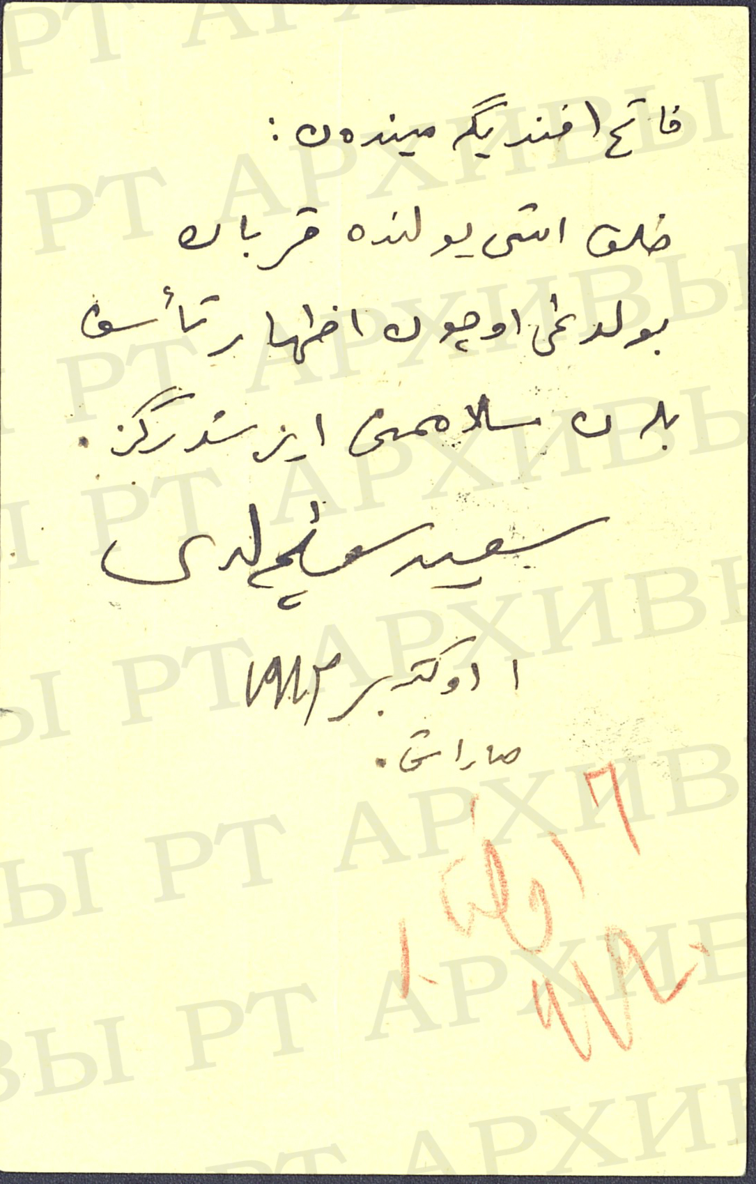 Почтовая карточка от Закира Рамиева о поездке Ф. Карими в Турцию в качестве корреспондента Балканской войны
