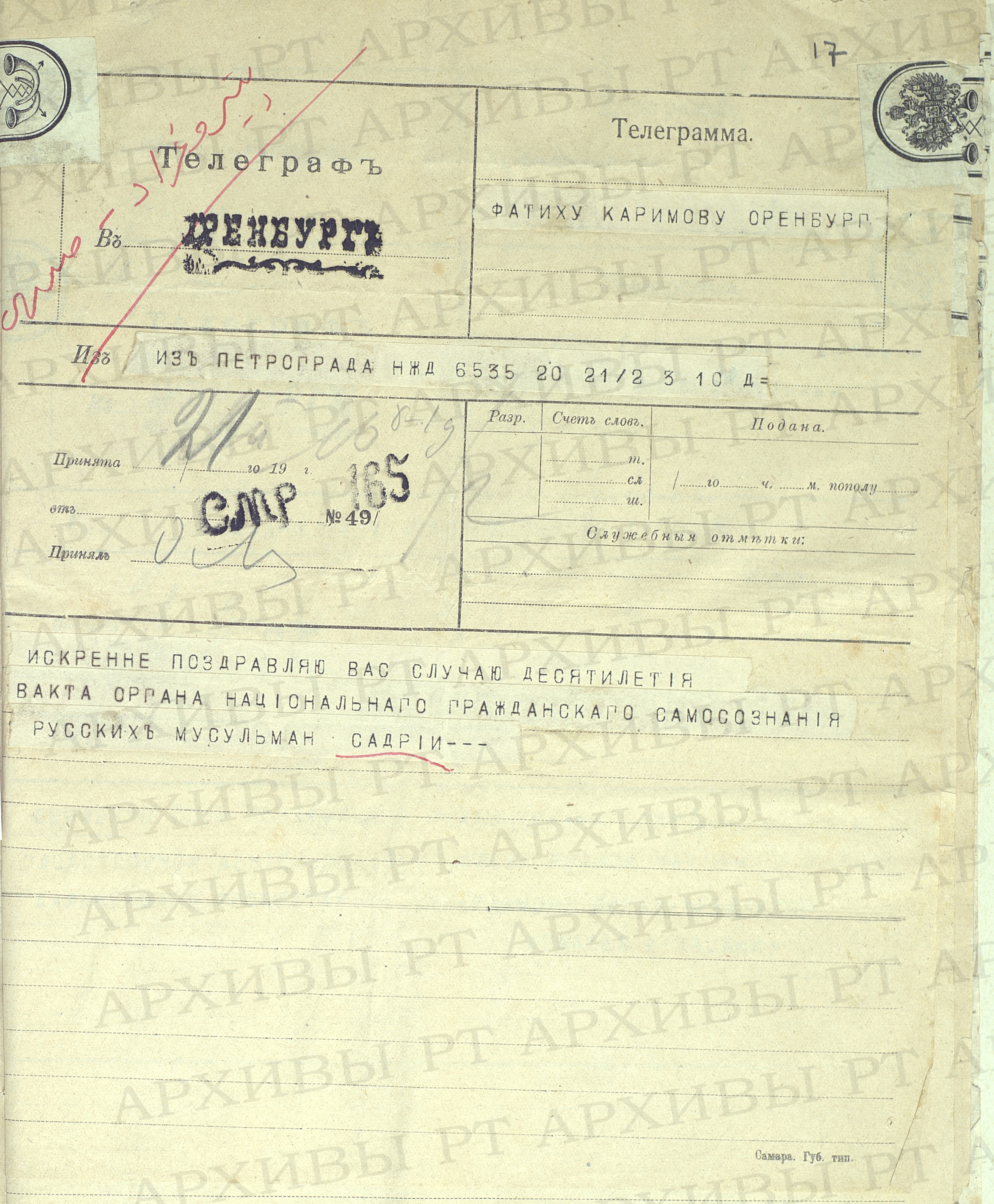 Поздравительная телеграмма Фатиху Карими по случаю 10-летия газеты «Вакыт» от Садри Максуди