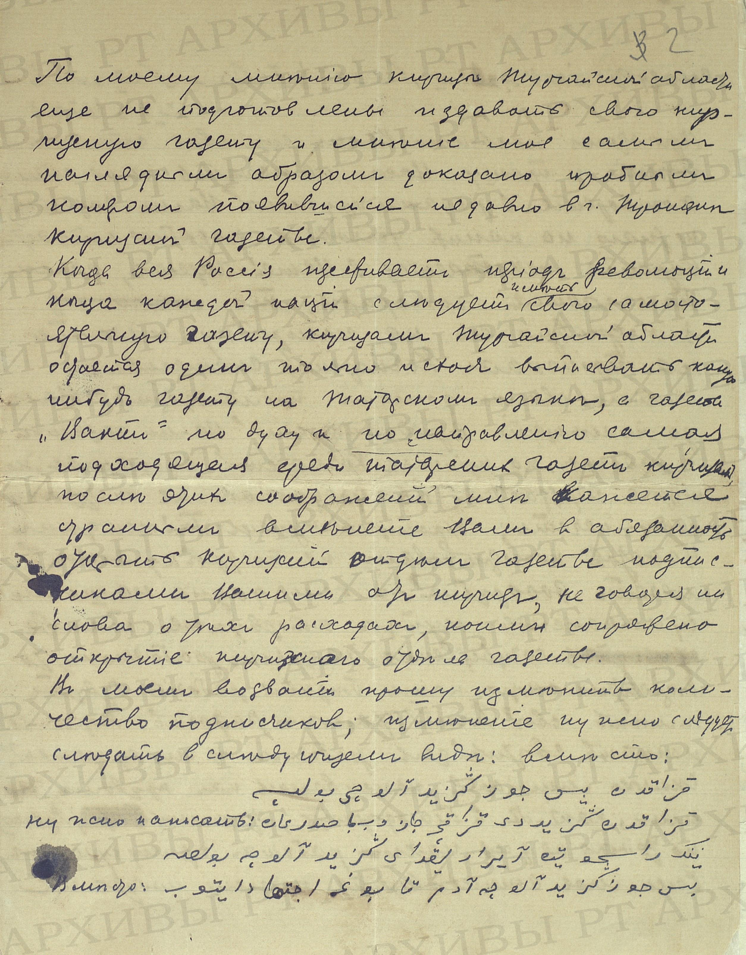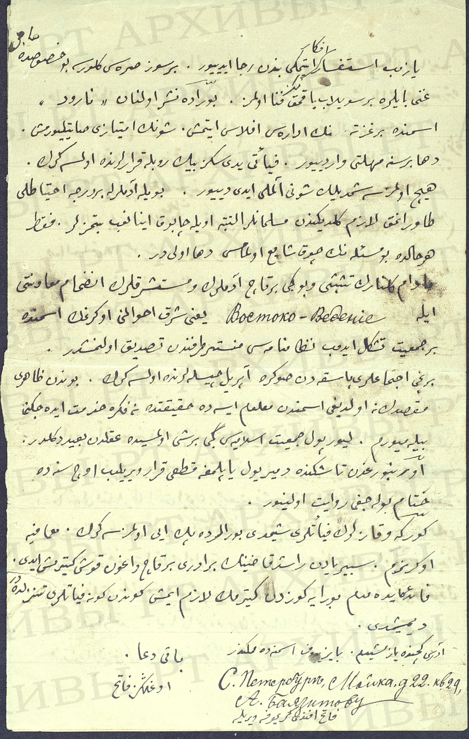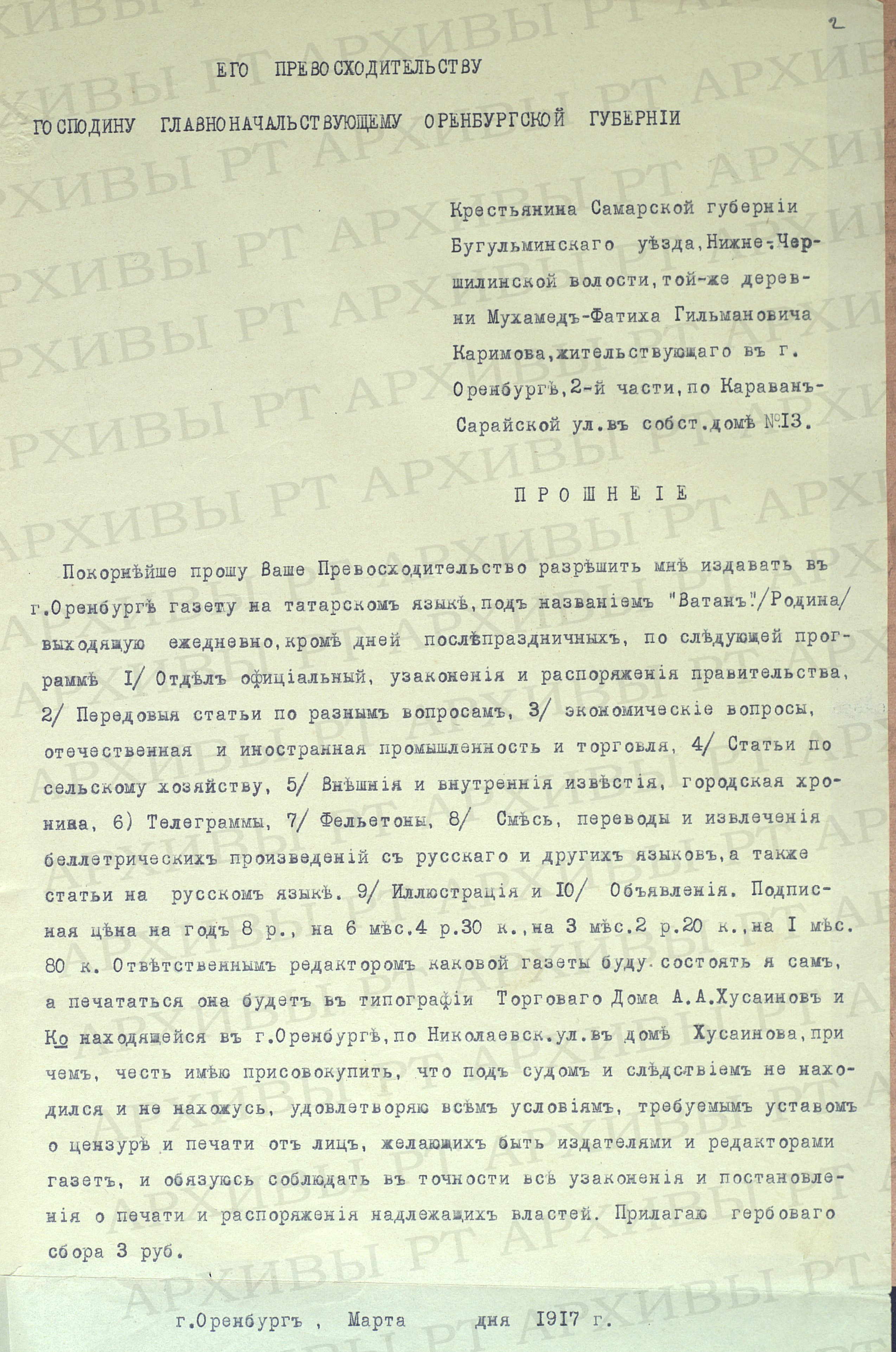Прошение Фатыха Карими на имя Главноначальствующему Оренбургской губернии разрешить издать на татарском языке в городе Оренбурге газету «Ватан»