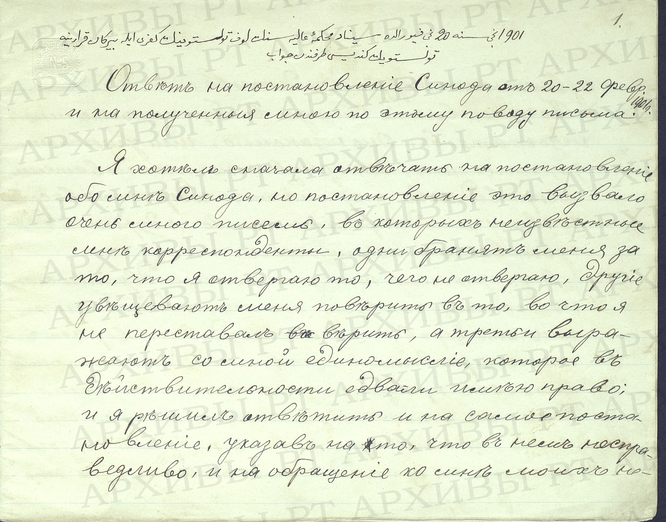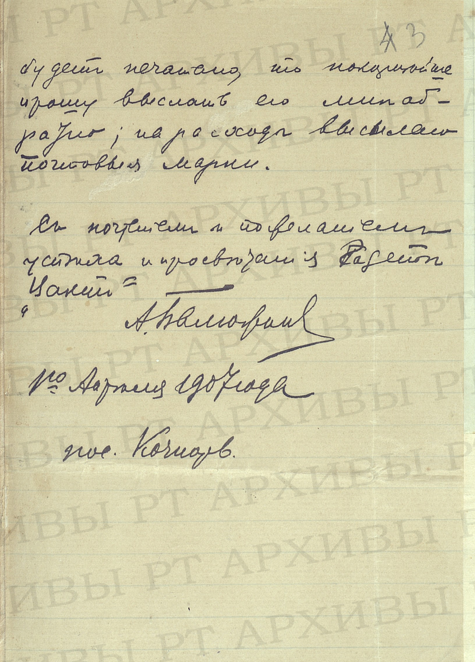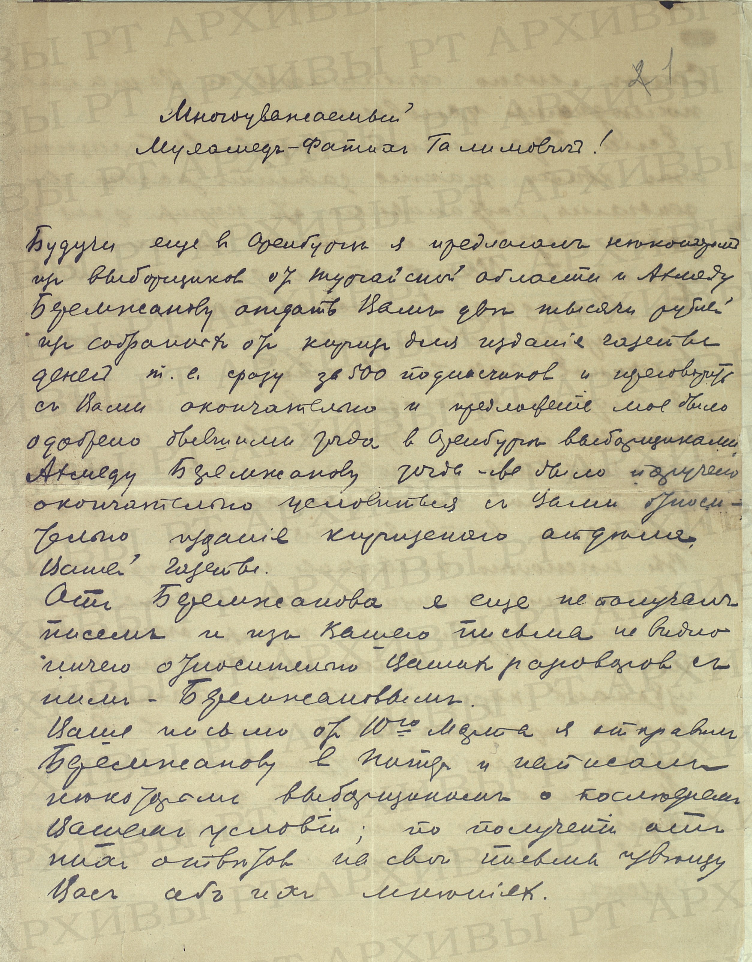 Прошение Фатыха Карими на имя Главноначальствующему Оренбургской губернии разрешить издать на татарском языке в городе Оренбурге газету «Ватан»