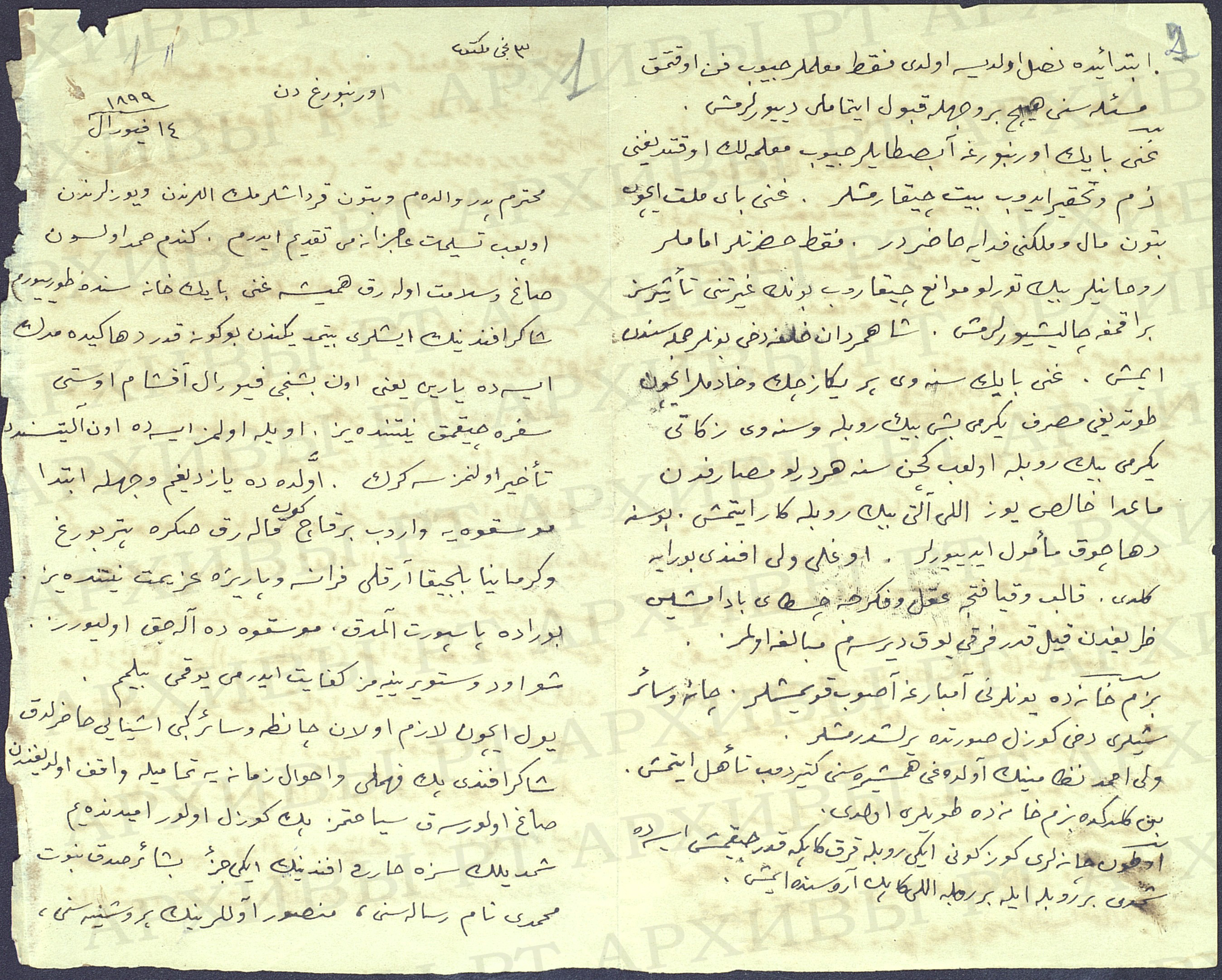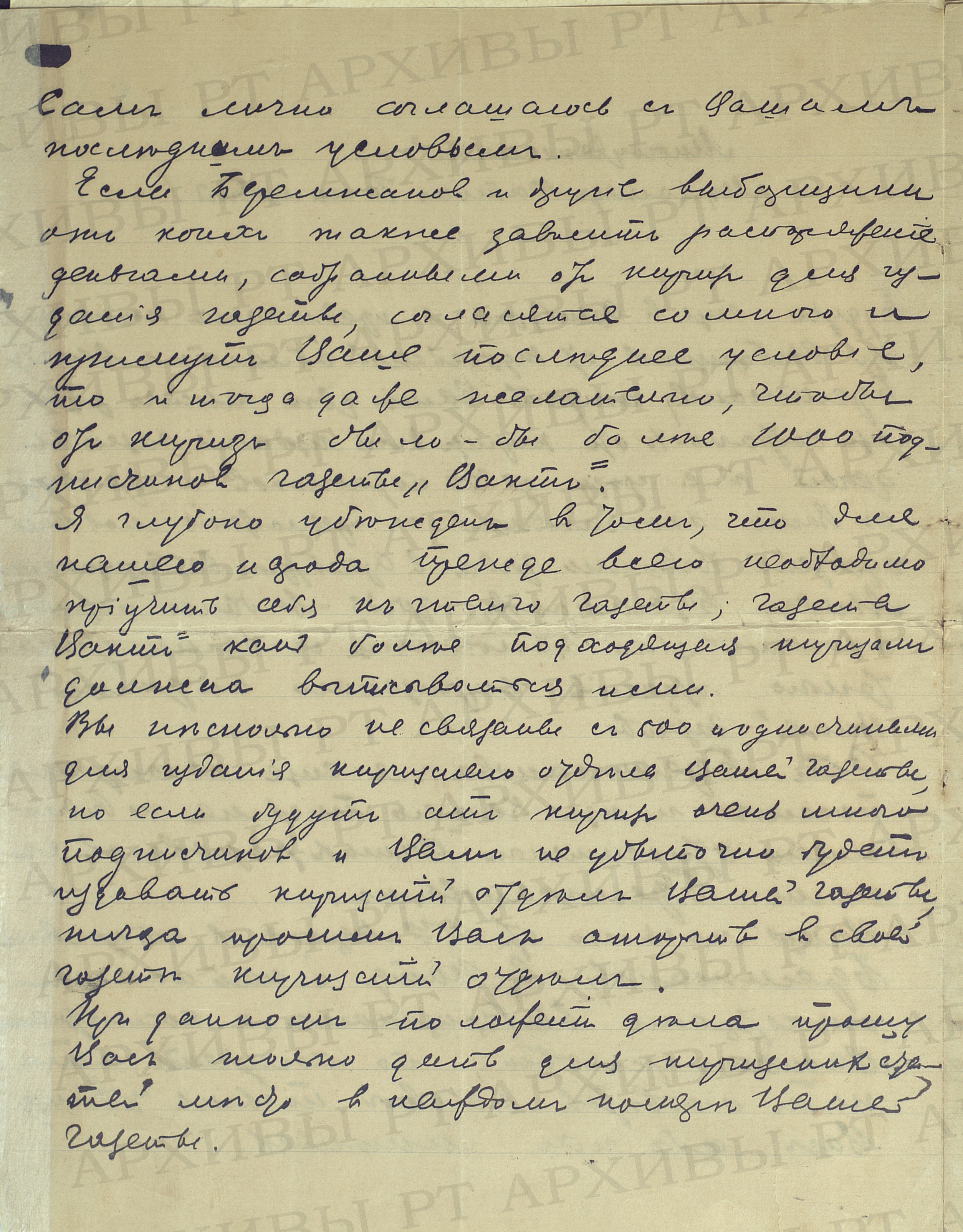 Письмо Юсуфа Акчуры из Стамбула о сотрудничестве с газетой «Вакыт»