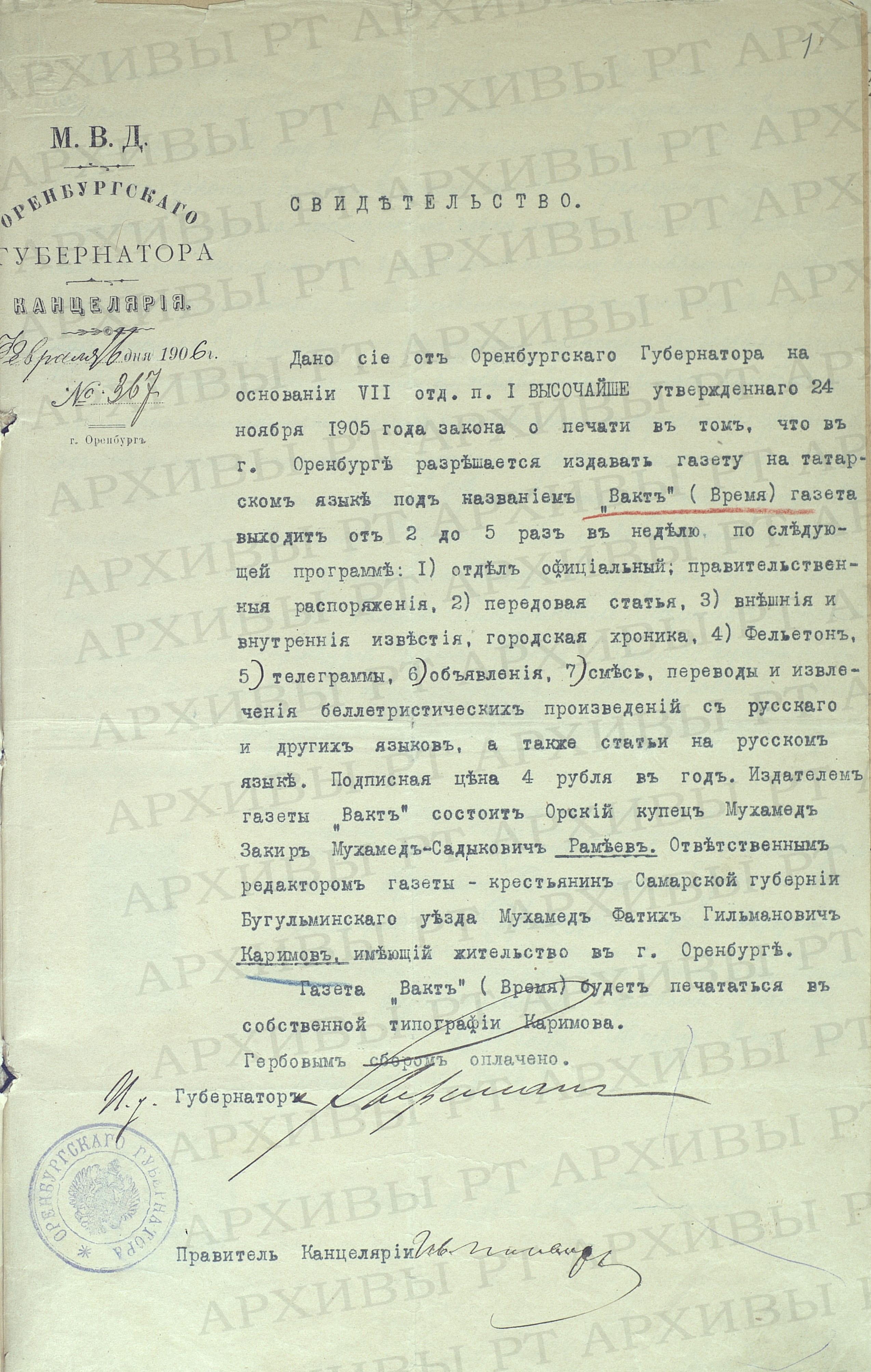 Свидетельство губернатора Оренбургской губернии о разрешении издавать газету на татарском языке под названием «Вакыт» (Время)