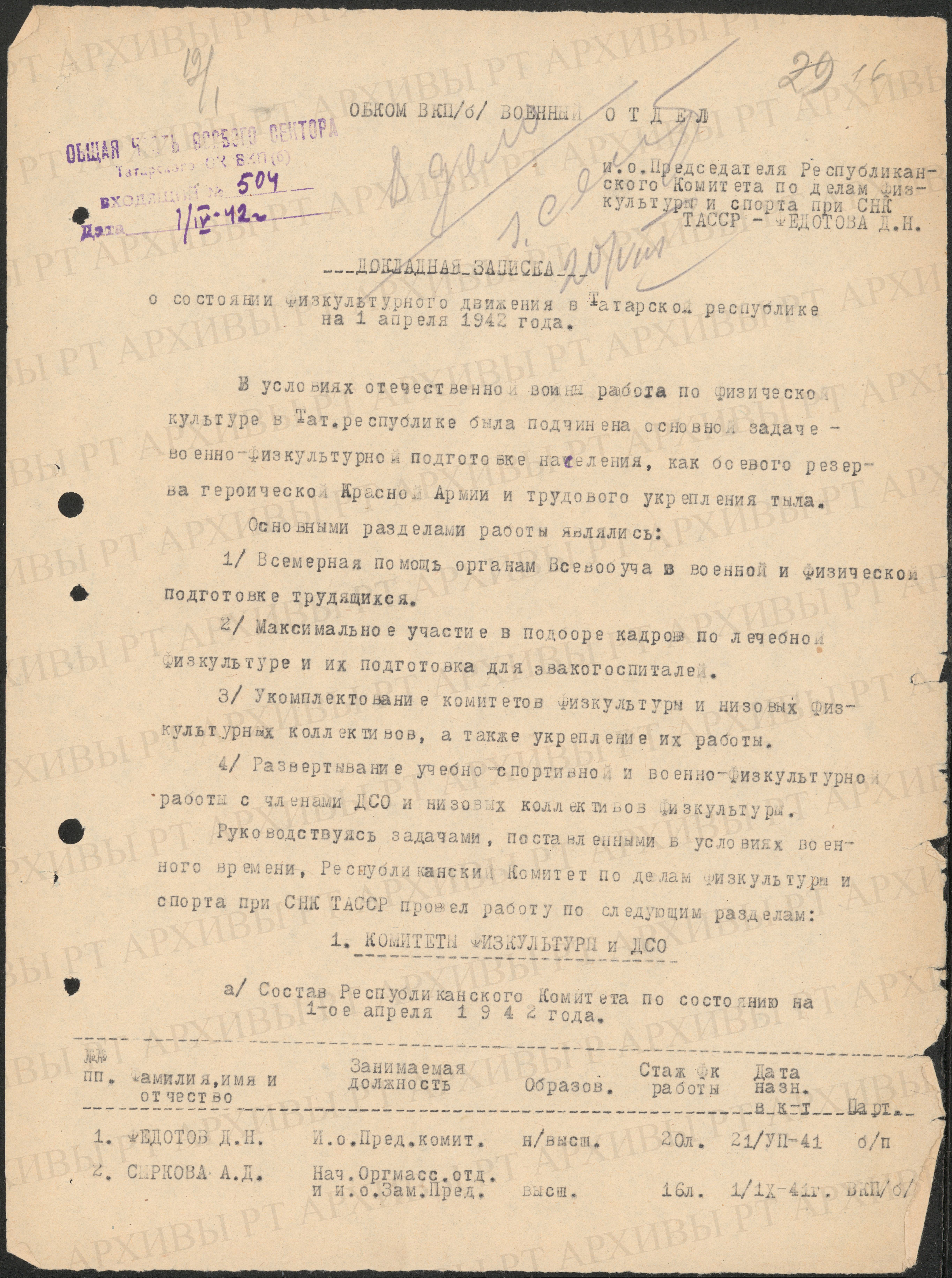 Докладная записка о состоянии физкультурного движения в Татарской республике на 1 апреля 1942 г.
