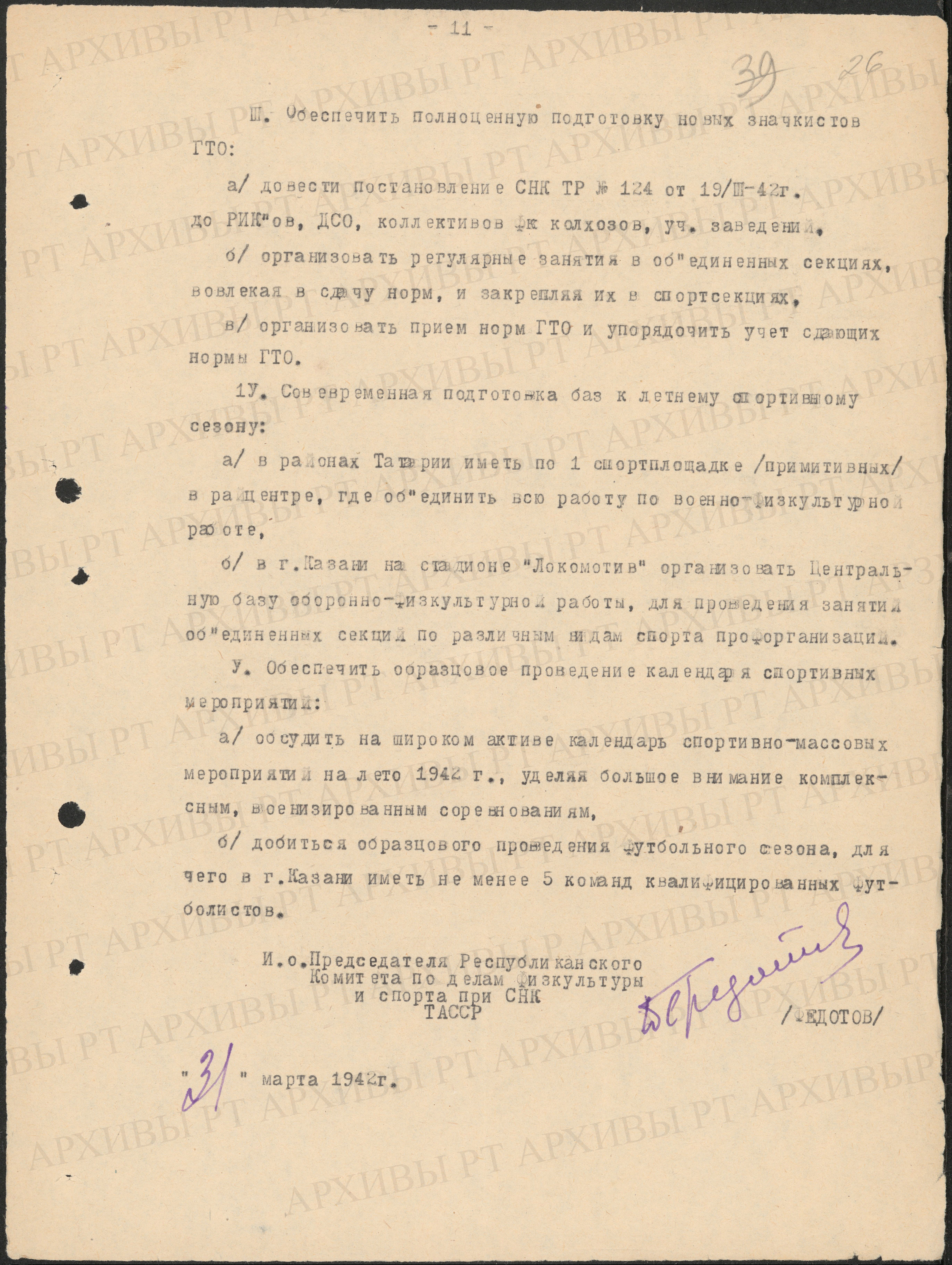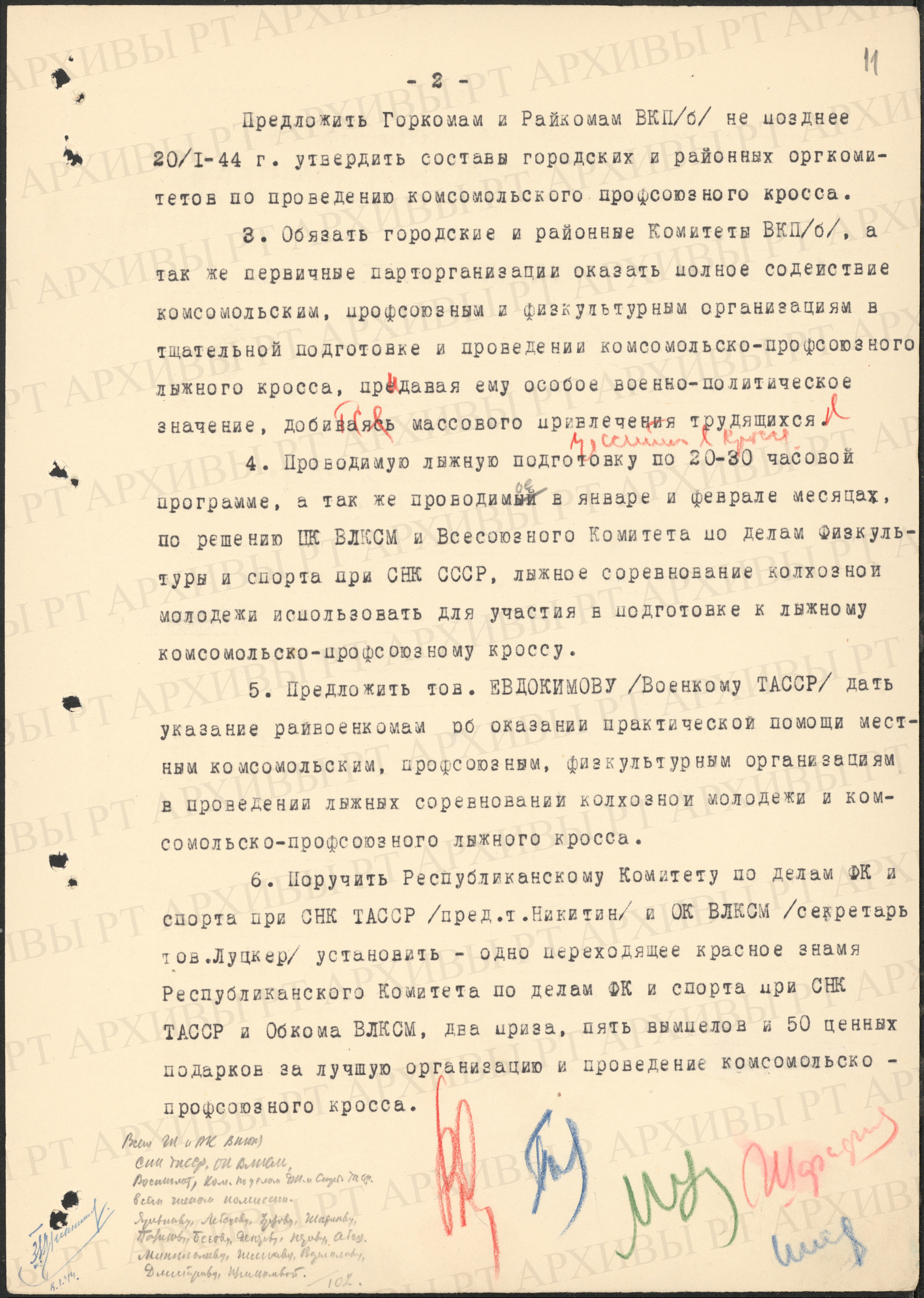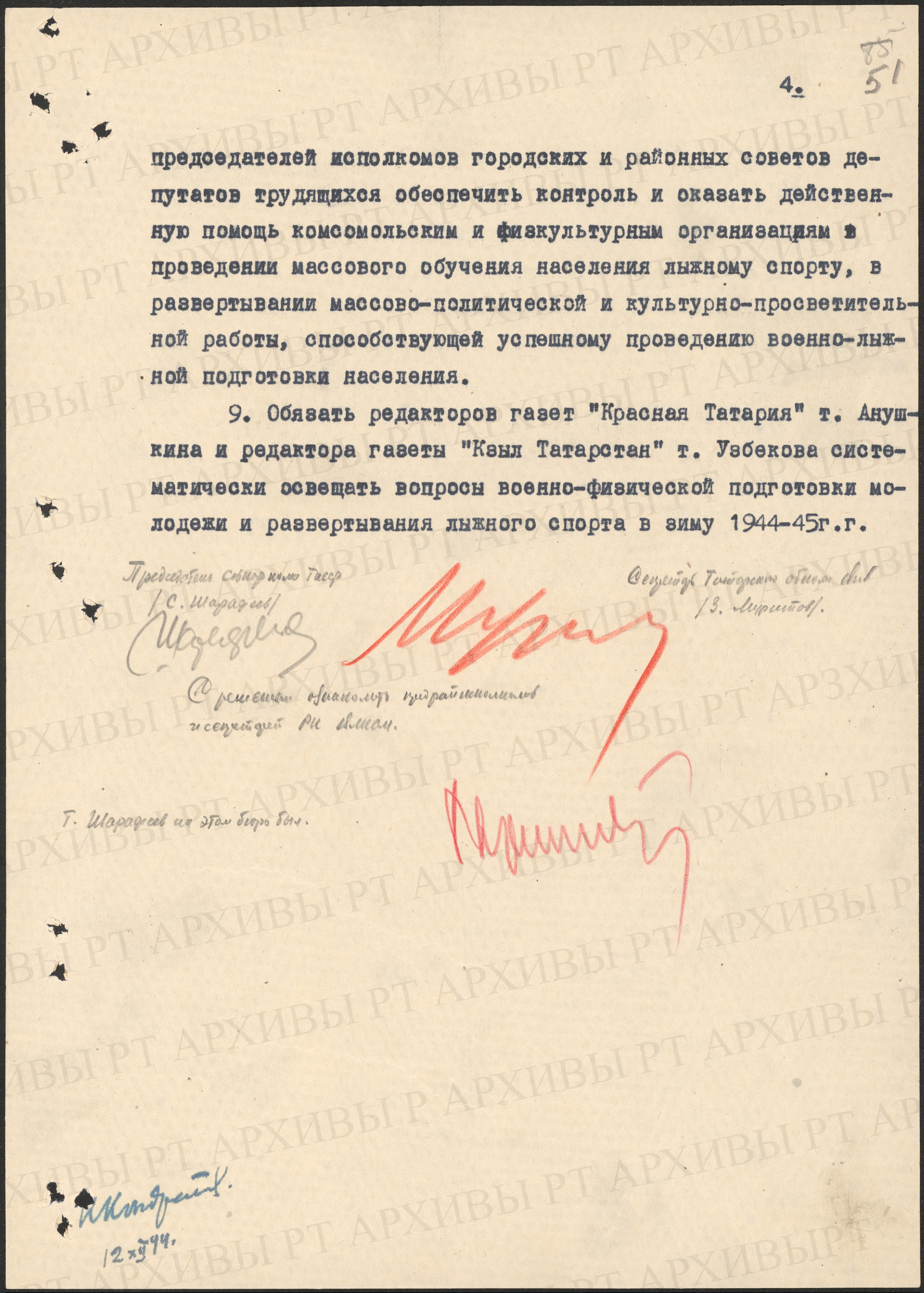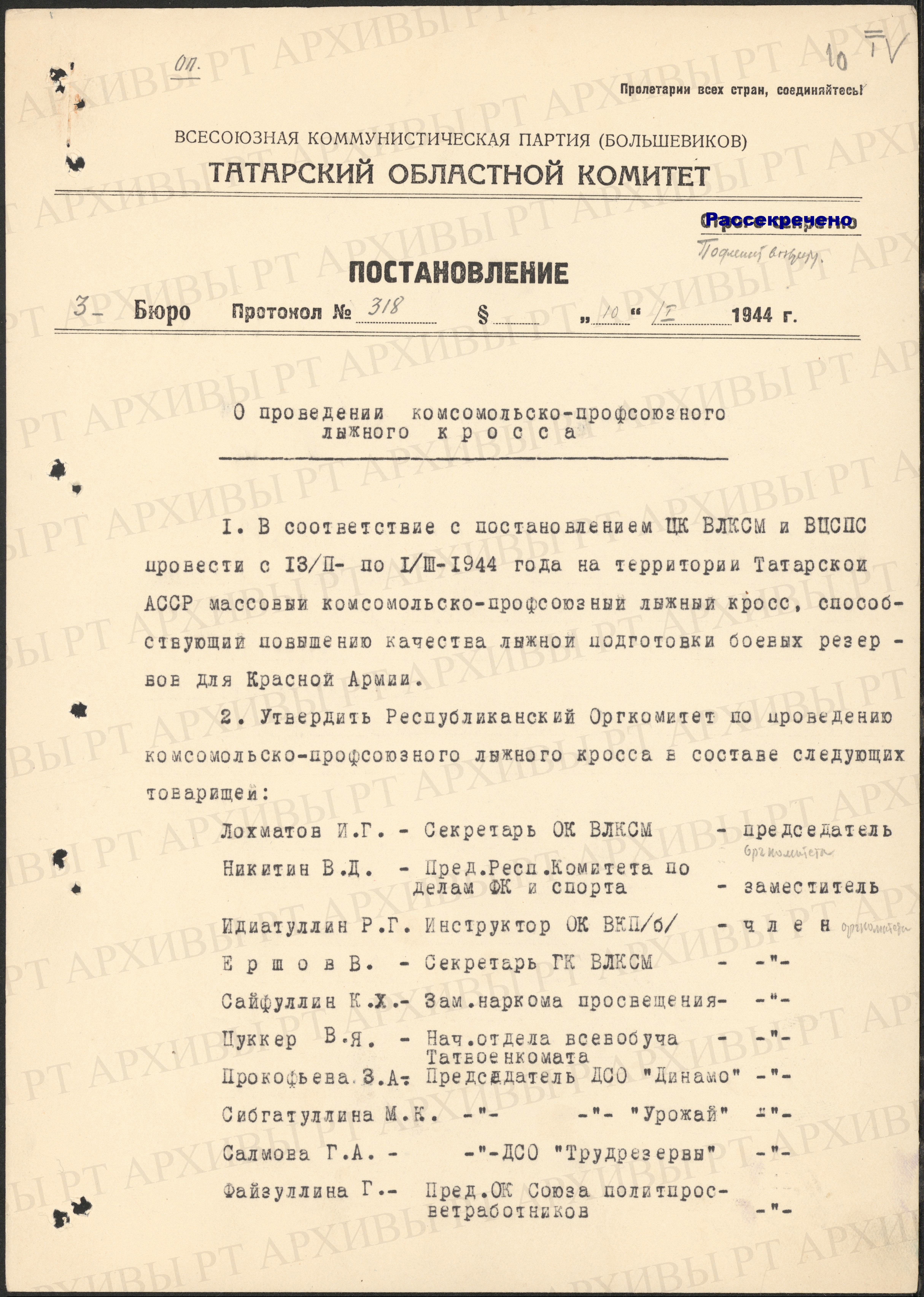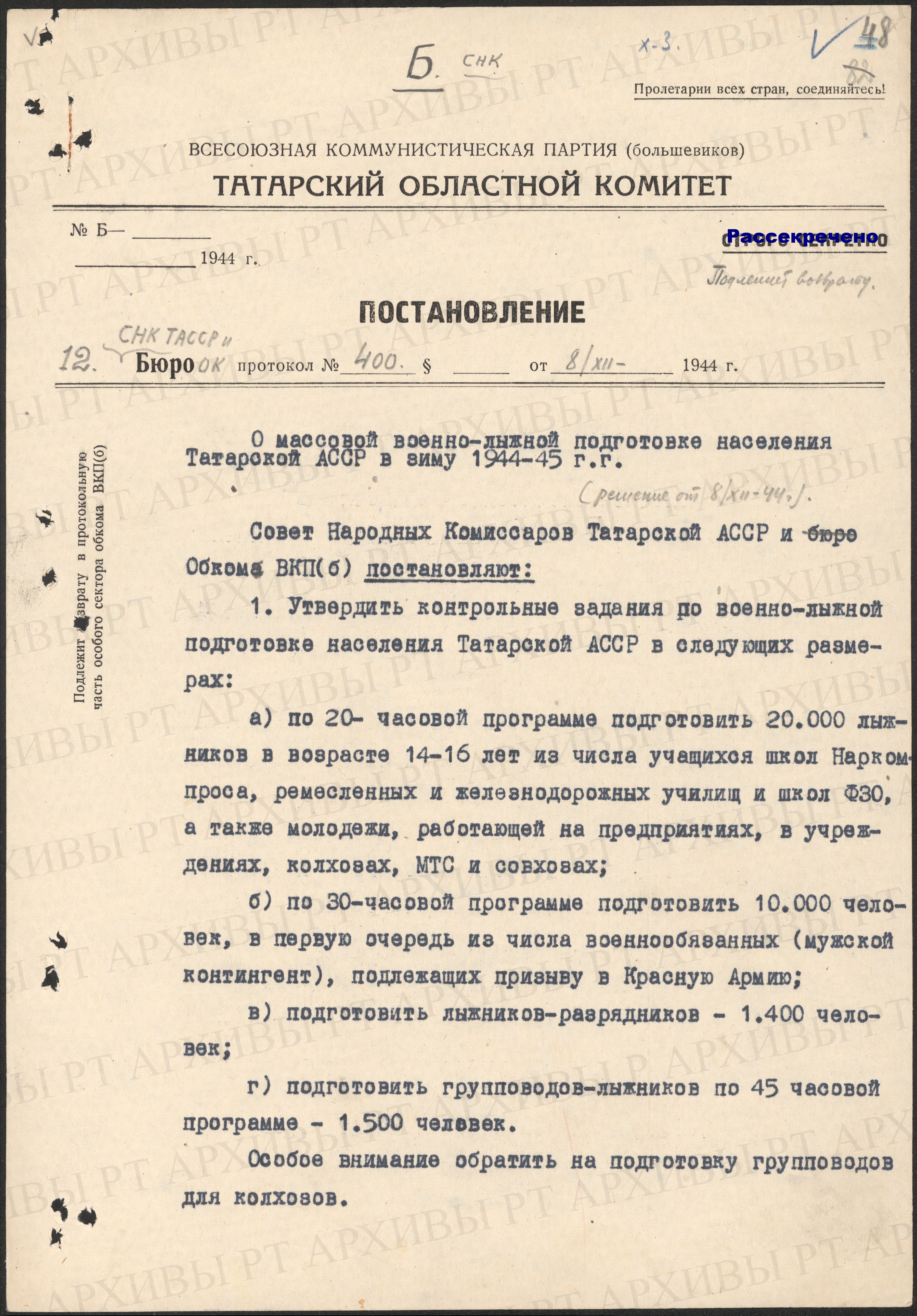 Постановление СНК ТАССР и обкома ВКП(б) «О массовой военно-лыжной подготовке населения ТАССР в зиму 1944-1945 гг.