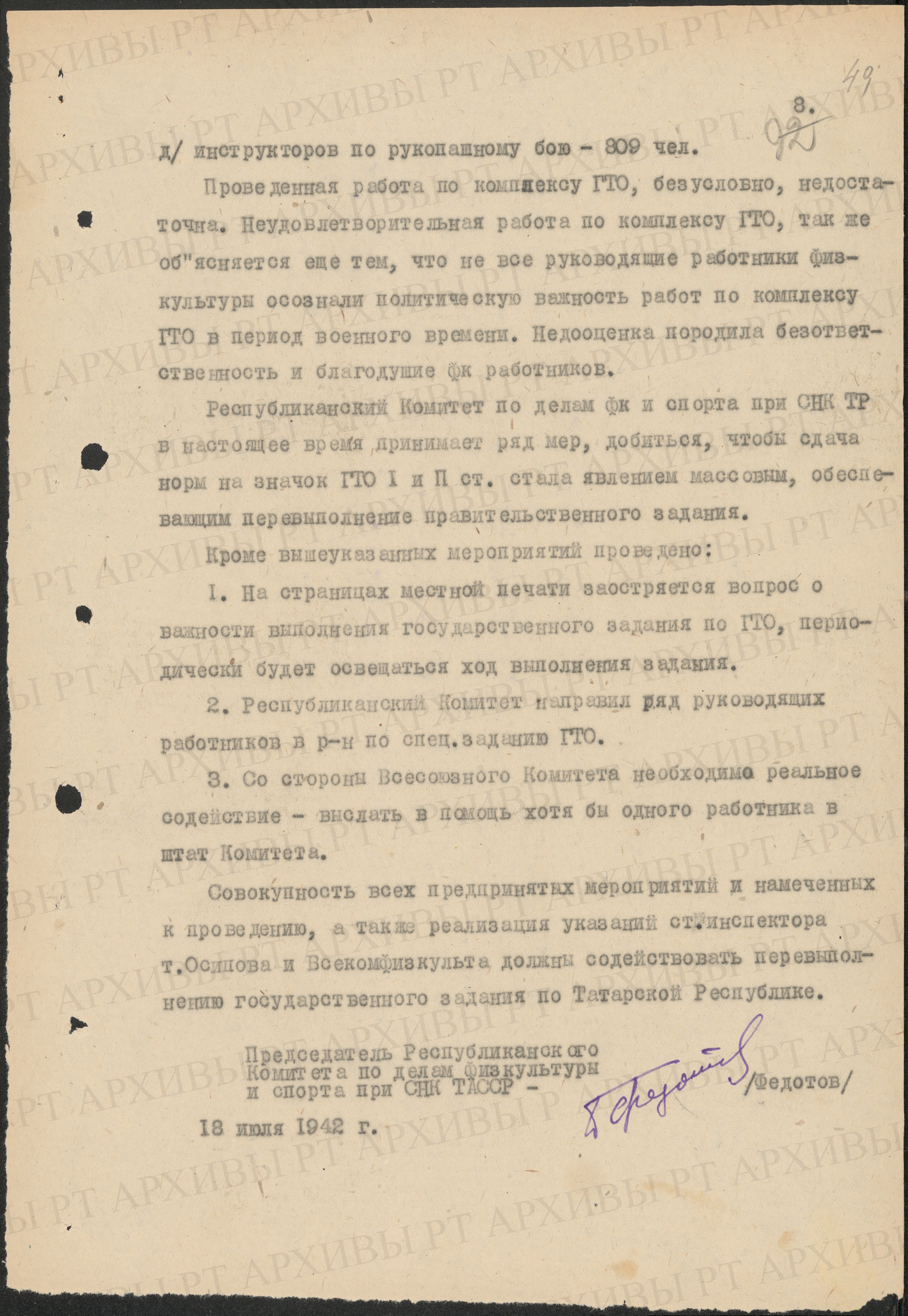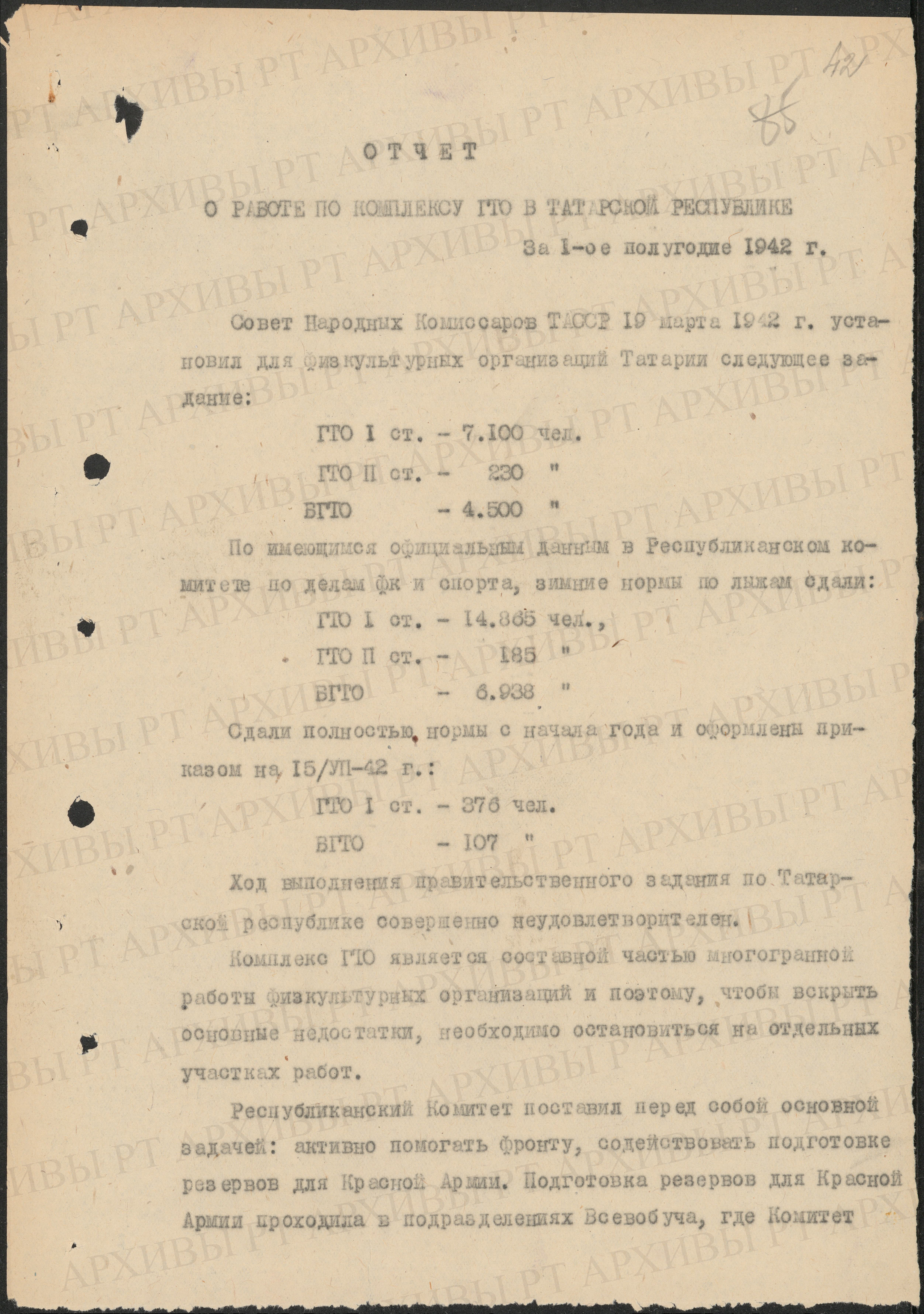 Отчет о работе по комплексу ГТО в Татарской республике за 1-ое полугодие 1942 г.