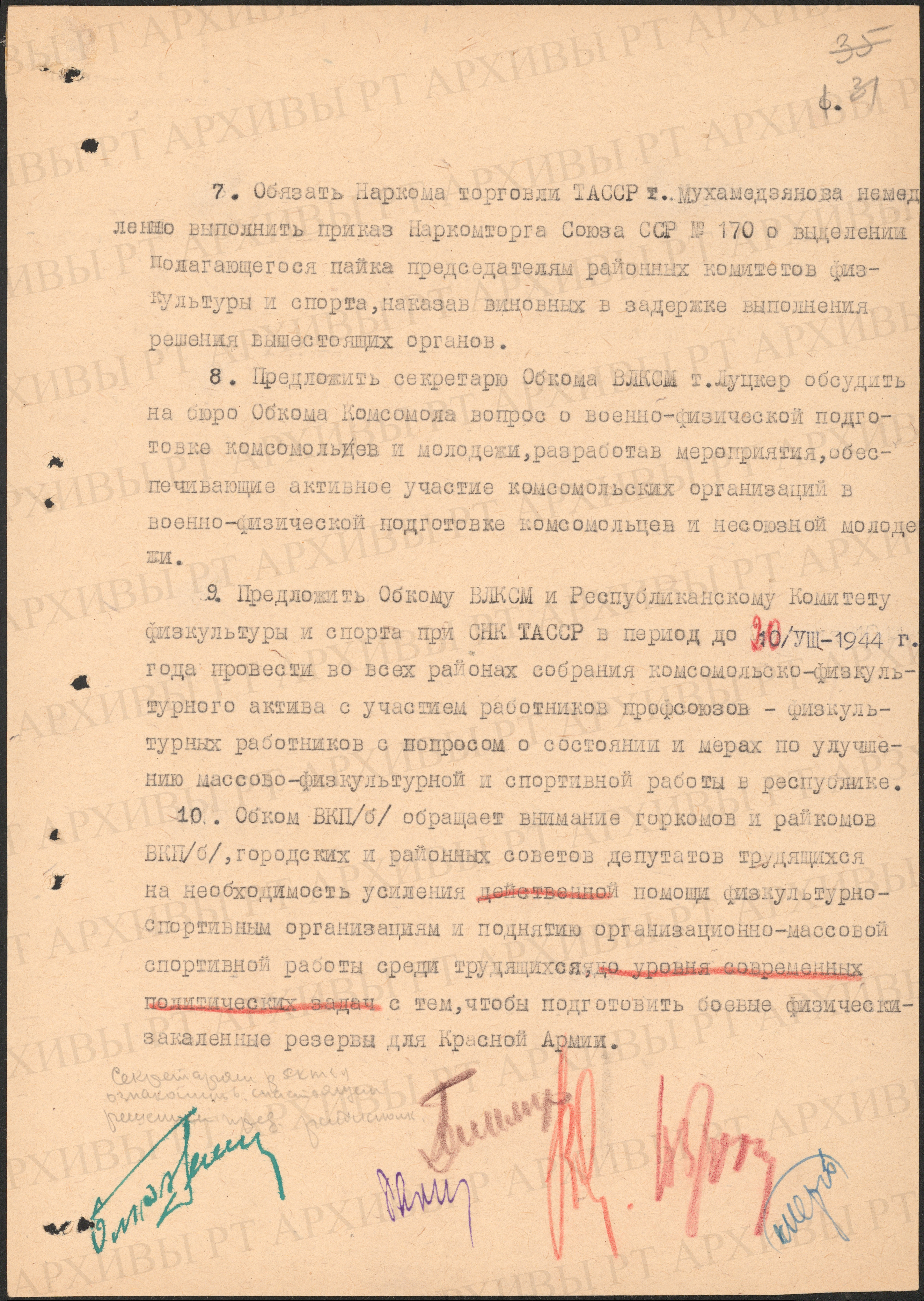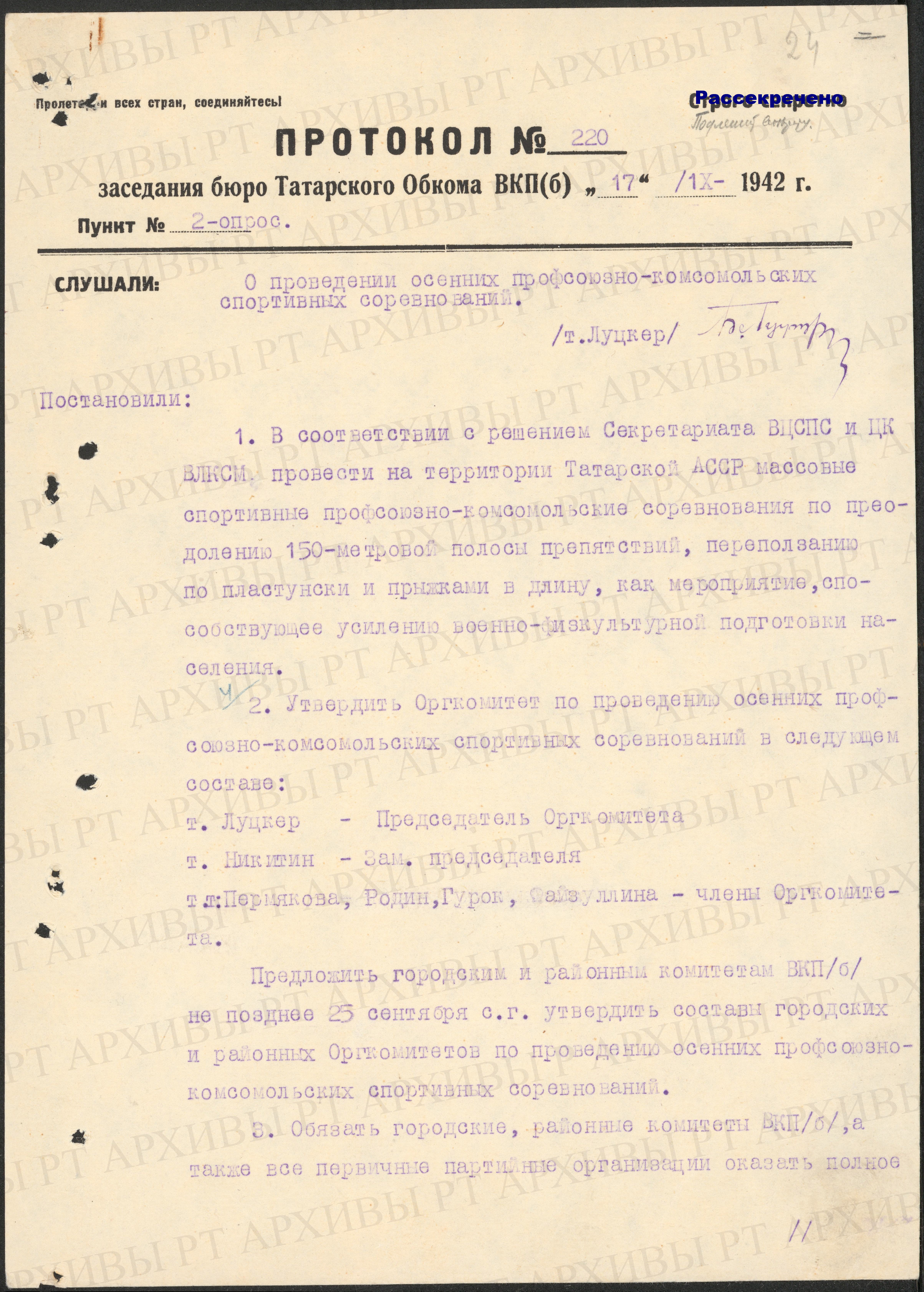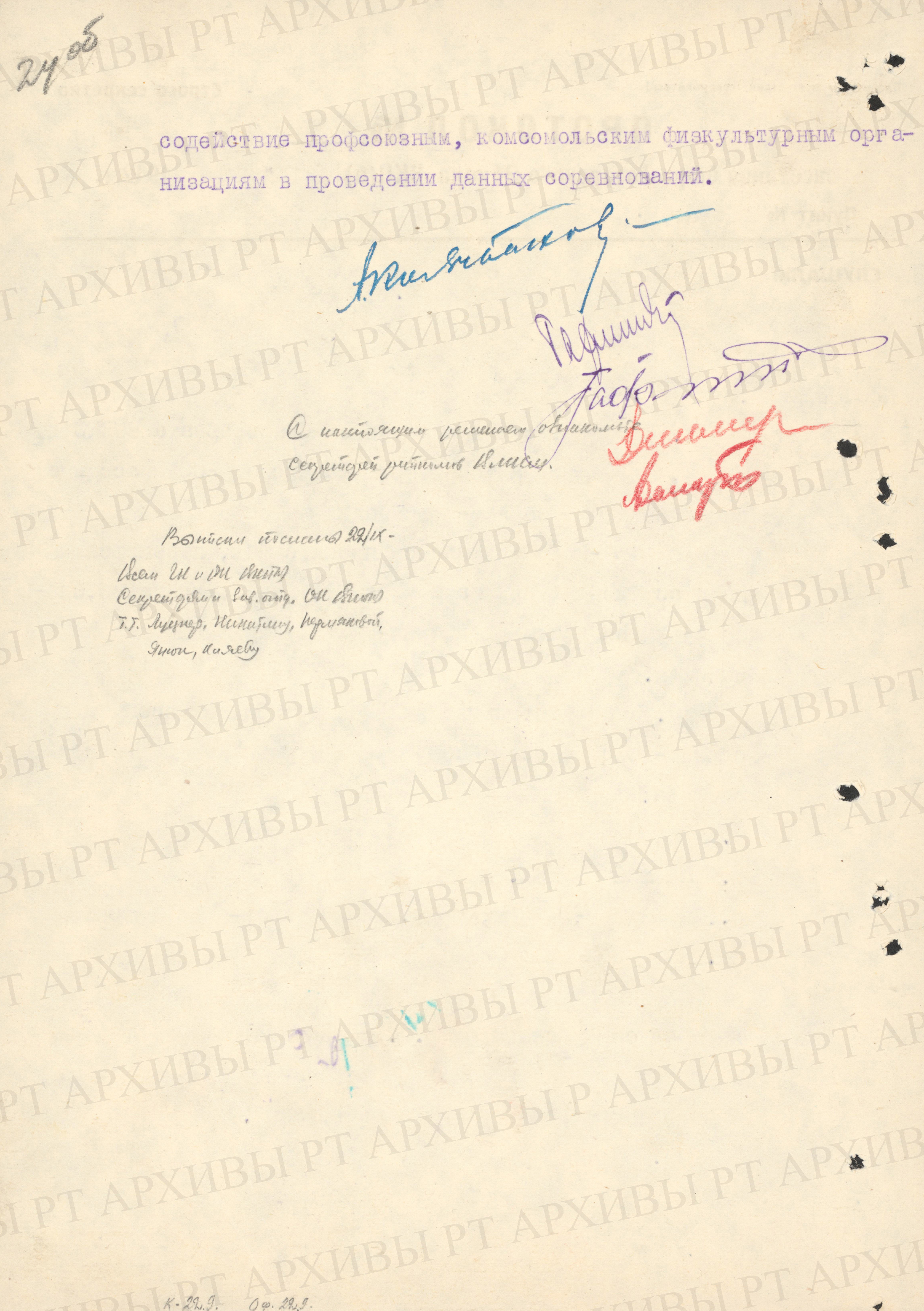 Постановление заседания бюро Татарского обкома ВКП(б) «О проведении осенних профсоюзно-комсомольских спортивных соревнований»