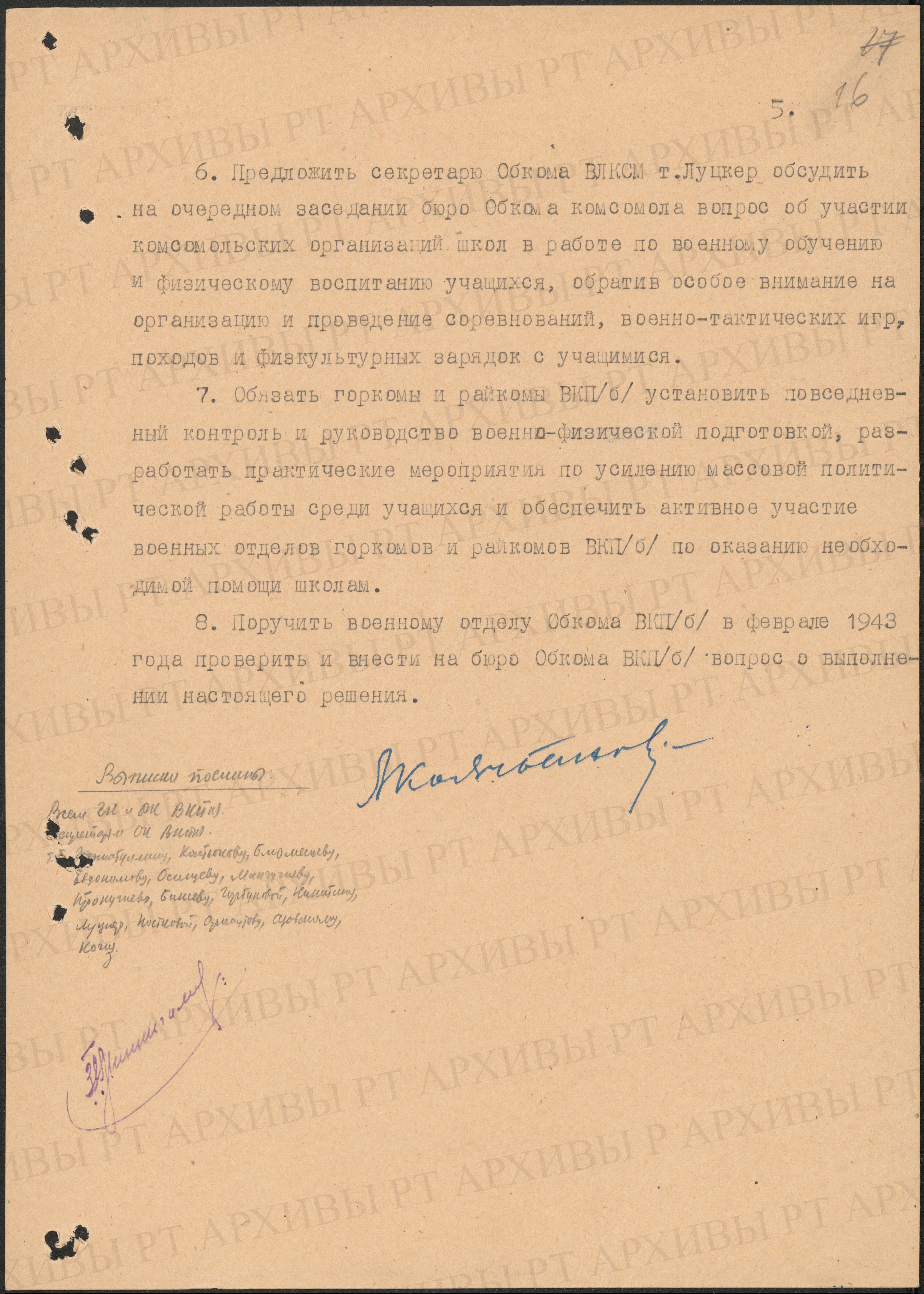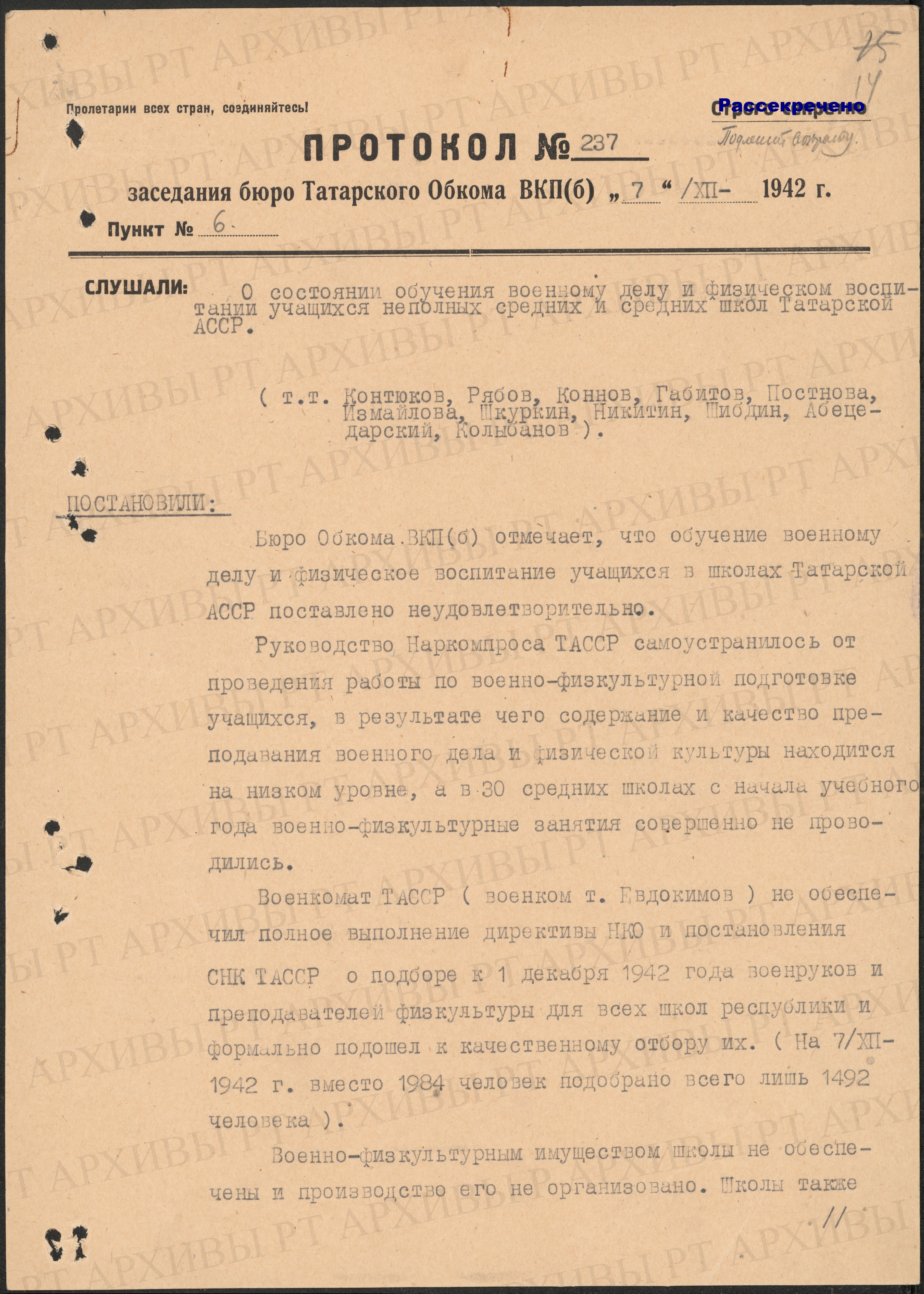 Постановление заседания бюро Татарского обкома ВКП(б) «О состоянии обучения военному делу и физическом воспитании учащихся неполных средних и средних школ ТАССР»