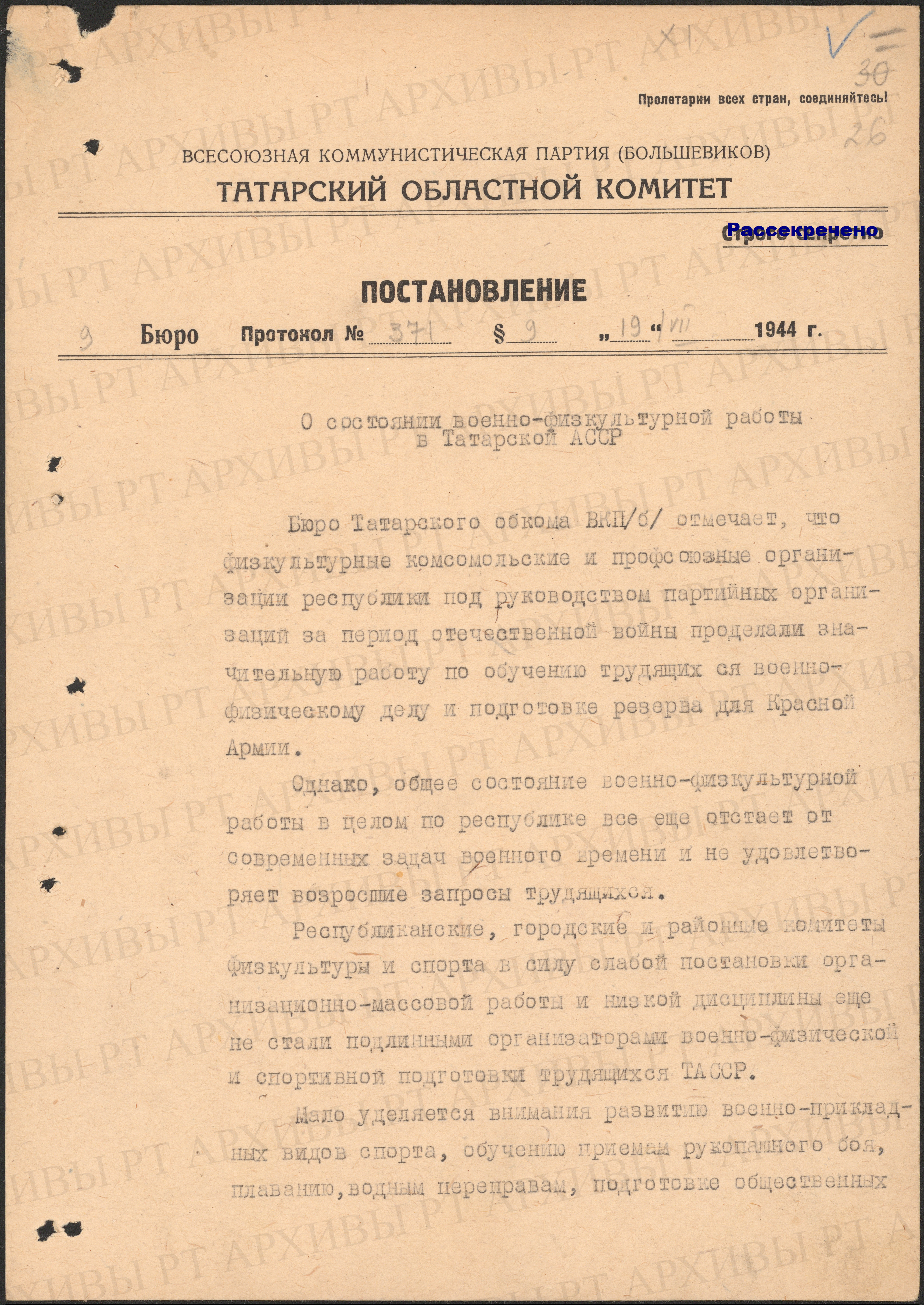 Постановление заседания бюро Татарского обкома ВКП(б) «О состоянии военно-физкультурной работы в ТАССР»