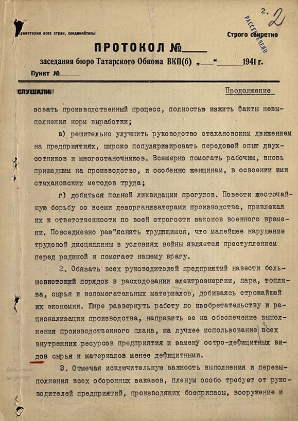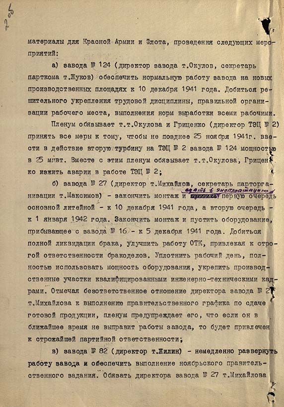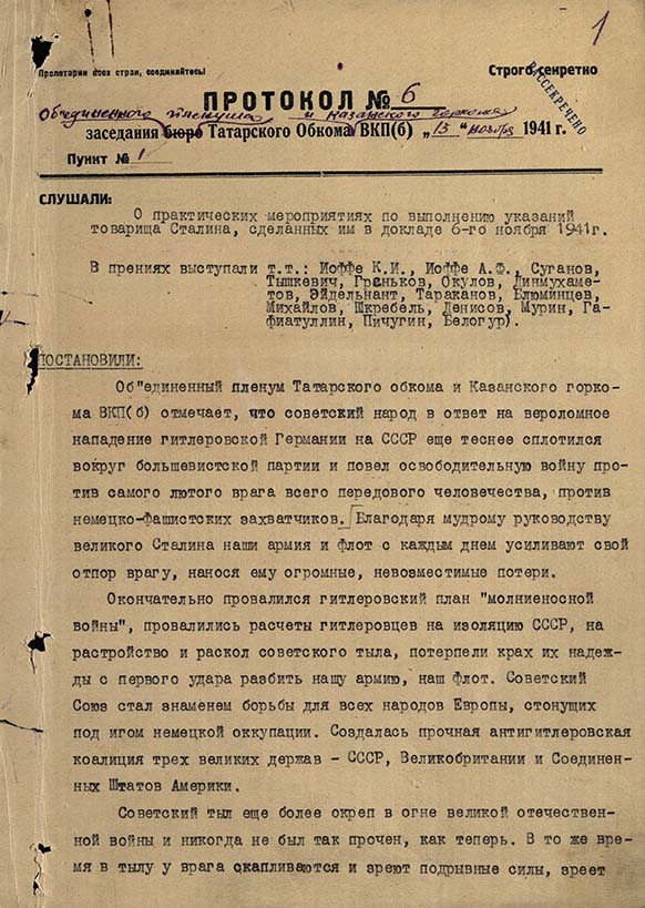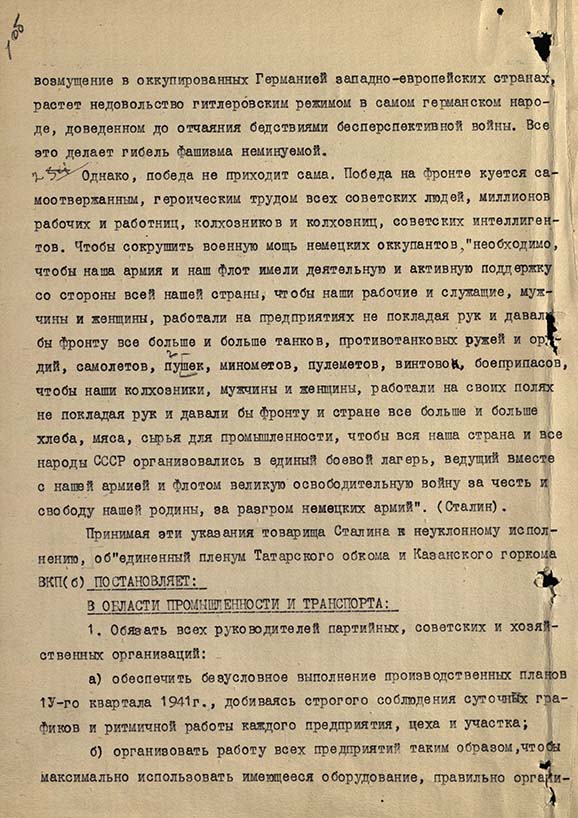 Из Постановления объединенного пленума Татарского обкома и Казанского горкома ВКП (б) о перестройки промышленности республики на военный лад, 13 ноября 1941 год
