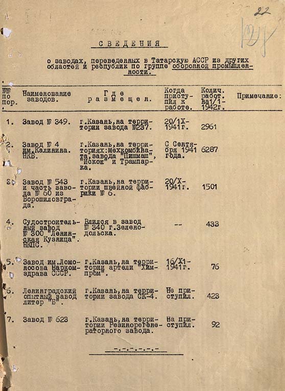 Сведения о заводах оборонной промышленности, переведенных в ТАССР из других областей и республик, 1941 год