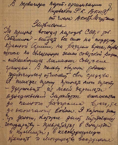 Заявление члена ВКП (б) А.П. Лагутченко об отчислении в фонд обороны страны однодневного заработка