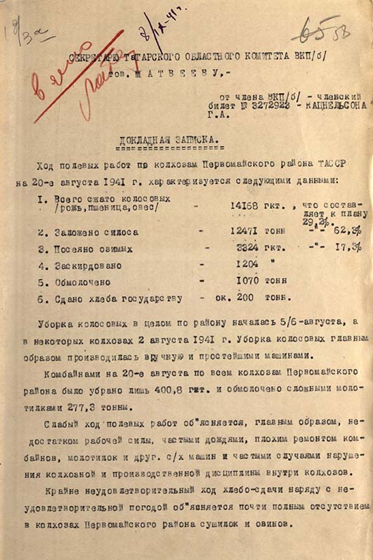 Докладная записка Первомайского райкома ВКП (б) Татарскому обкому ВКП (б) о ходе сбора урожая по колхозам района