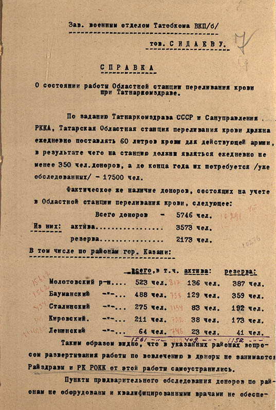 Справка о состоянии работы областной станции переливания крови при Татнаркомздраве