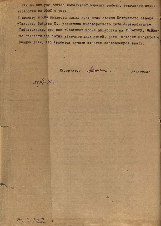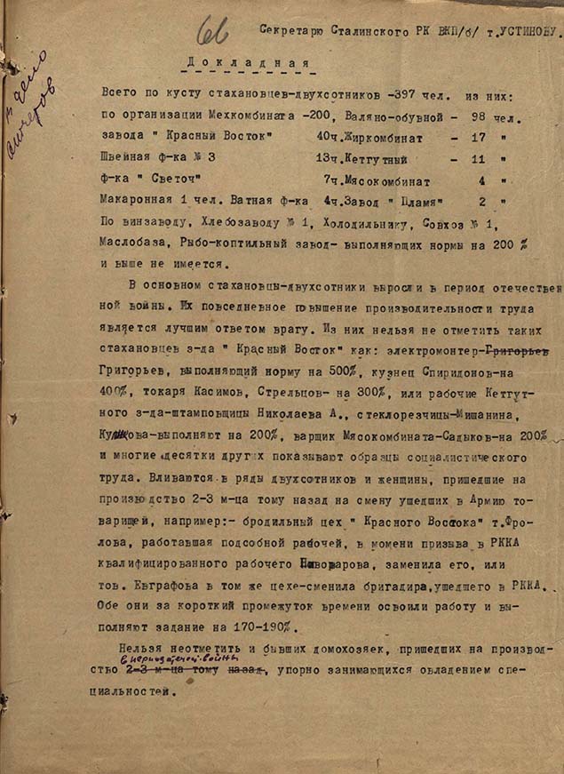 Докладная записка инструктора Сталинского райкома ВКП (б) города Казани секретарю райкома ВКП (б) о стахановцах-двухсотниках
