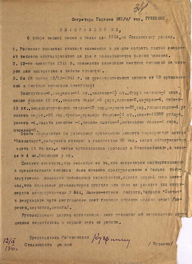Информации Райкомиссии Сталинского района города Казани в Казанский горком ВКП (б) о сборе теплых вещей и белья для РККА по Сталинскому району