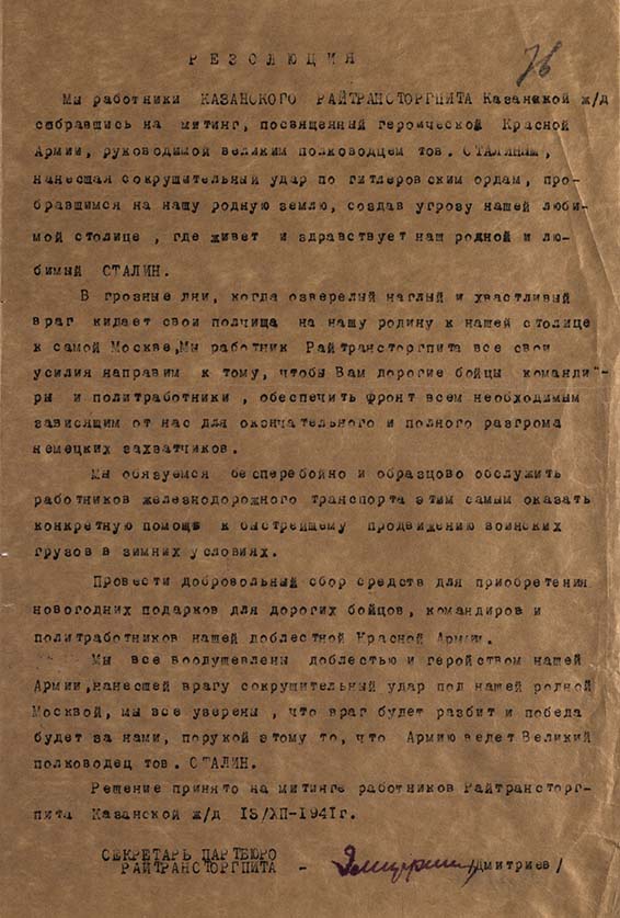 Резолюция митинга работников Казанского райтрансторгпита Казанской железной дороги об усилении помощи фронту в связи с победой Красной Армии по Москвой
