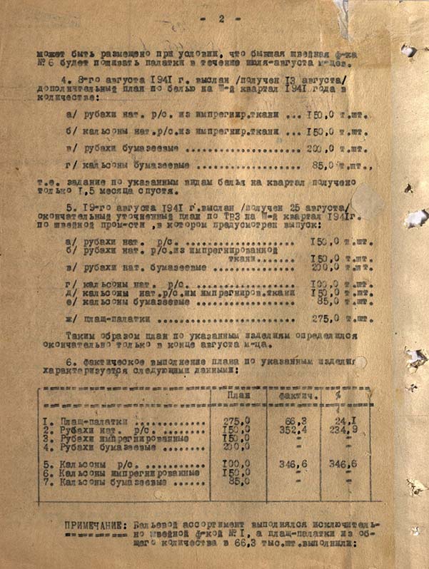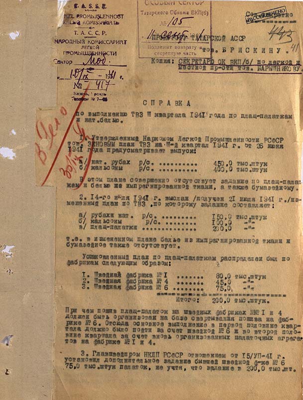 Справка Наркомата легкой промышленности ТАССР в Татарский обком ВКП (б) по выполнению плана по плащ-палаткам и нательному белью для бойцов